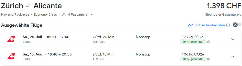 Die günstigsten Tickets zu unserem Wunschtermin +/-2 Tage lagen bei 1.400 CHF (etwa 1.520 Euro).
