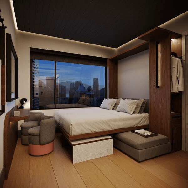So wird man Klappbetten in der Wand installieren, welche zwar ausgeklappt fast das gesamte Zimmer einnehmen, allerdings kann man hier auch für den Tag eine Art Wohnzimmer gestalten.