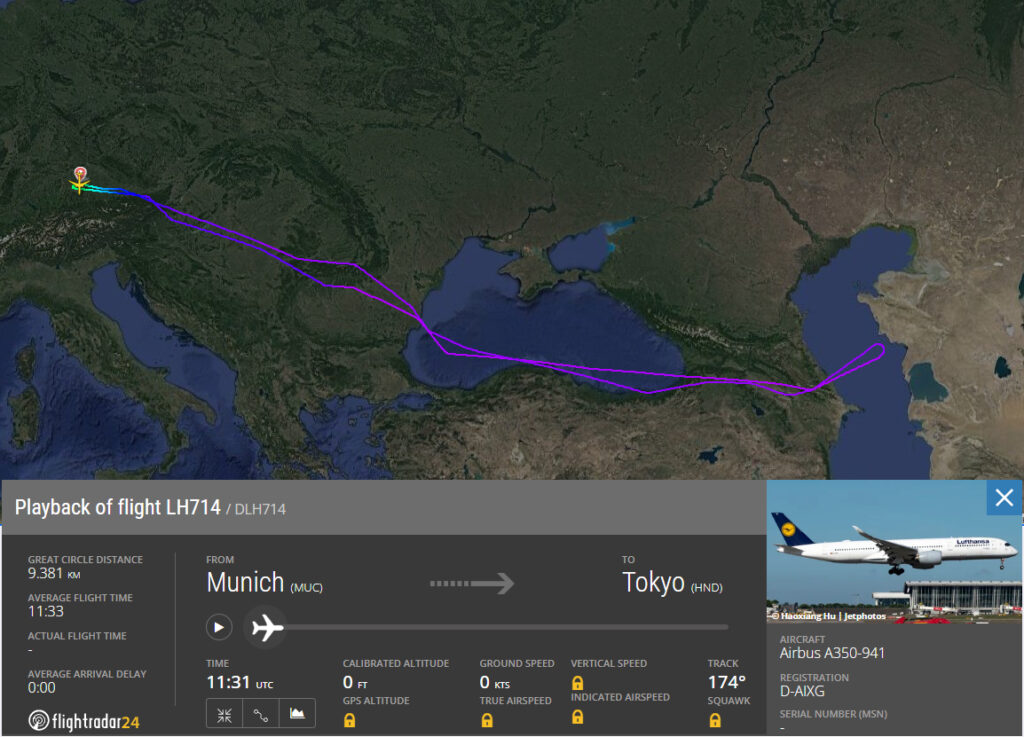 Normalerweise dauert der Flug nach Tokio rund elf Stunden und 30 Minuten. Doch nicht an diesem Tag. Denn „schon“ nach acht Stunden und 30 Minuten landete das Flugzeug mit der Registrierung D-AIXG wieder. Nur leider nicht in Japan, sondern wieder in München. Nach etwa vier Stunden Flugzeit drehte der Airbus A350 über dem Kaspischen Meer, noch bevor er den Luftraum Kasachstans erreichte. Die restlichen vier Stunden ging es quasi auf derselben Route zurück nach Deutschland.