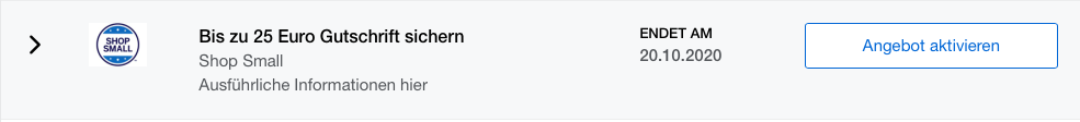 Im Detail bekommt Ihr bei jeder Zahlung bei den Shop Small Partnern 5 Euro wieder gutgeschrieben, wobei man pro Karte das Angebot fünf Mal nutzen kann. In Summe könnt Ihr also 25 Euro an Cash Back sammeln.