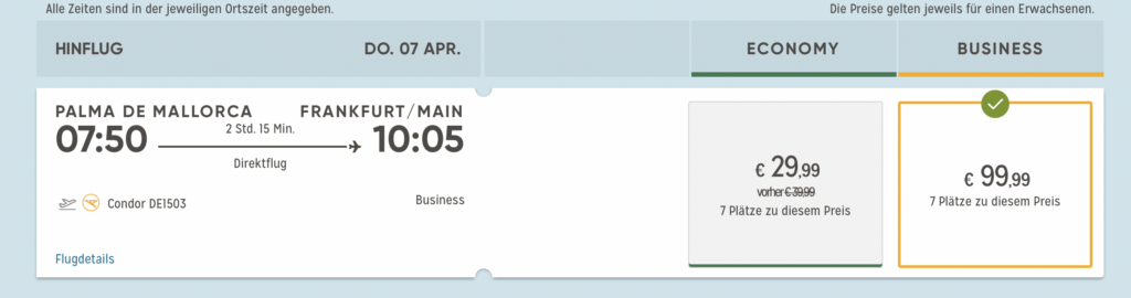 Durch den 20 Euro Gutschein, kann man die neue Condor Business Class auf dem Flug von Mallorca nach Frankfurt z.B. ab 80 Euro als oneway buchen. Aber auch der Hin- und Rückflug ist für um die 220 Euro zu haben, was ein unglaublich guter Deal ist.