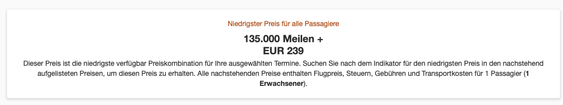 Etwas günstiger wird es, wenn man einen Hin- und Rückflug bucht, hier ruft Emirates Skywards einen Preis von 135.000 Meilen und 239 Euro an Steuern und Gebühren auf.