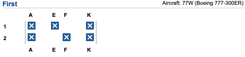 Um sicher zu stellen, dass auch wirklich die neue Emirates First Class auf Eurem Flug geplant ist, hilft ein Blick in die Seat Map. Hier solltet Ihr nur sechs First Class Sessel sehen, während in der alten Emirates First Class acht Sessel in der Boeing 777-300er verbaut sind.