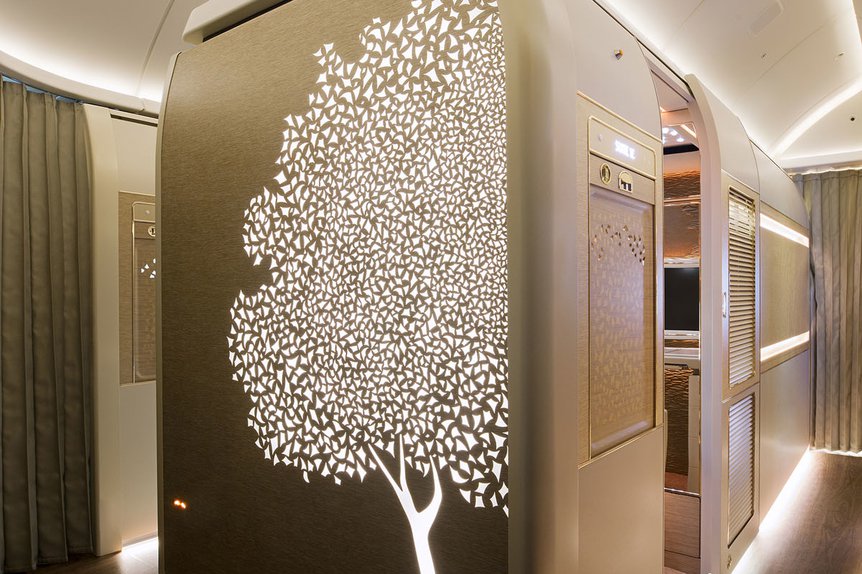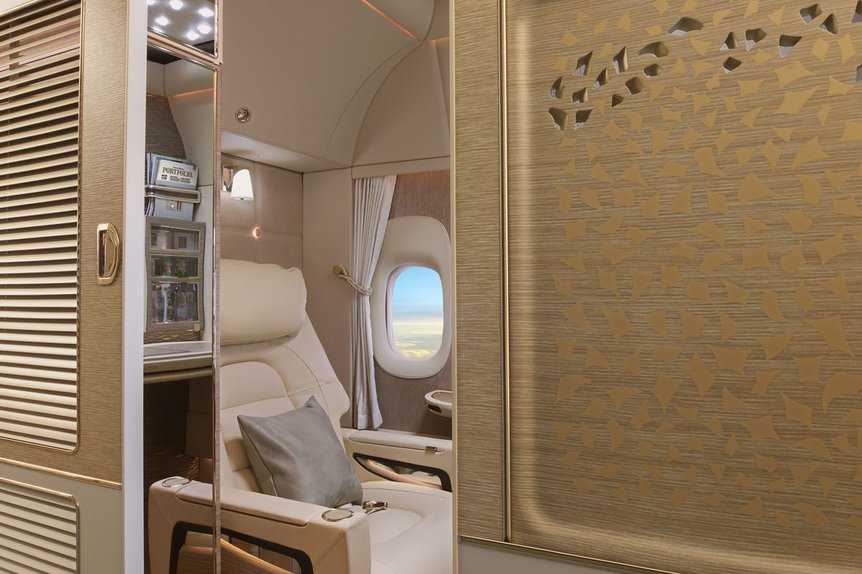Die neue First Class von Emirates ist moderner und weniger pompös gestaltet als der Vorgänger. Zudem ist die First Class Suite ein komplett abgetrennter Raum. Das heißt, dass die Türen und Wände bis zur Kabinendecke reichen. Dieses Maß an Privatsphäre dürfte unerreicht sein. Das Bett lässt sich selbstverständlich komplett flach stellen. Es ist 30 Zoll (75 Zentimeter) breit und 78 Zoll oder knapp zwei Meter lang. Somit hat man genügend Platz, um sich in der Suite umzuziehen.
