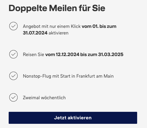 Das Angebot gilt für Linienflüge von Frankfurt nach Tulum, die von Discover Airlines im Reisezeitraum vom 12.12.2024 bis zum 31.03.2025 durchgeführt werden. Sie erhalten doppelte Meilen. Für die Teilnahme an der Aktion ist eine einmalige, kostenlose Aktivierung des Angebots vom 01. bis zum 31.07.2024 erforderlich. Es können nur Buchungen berücksichtigt werden, bei denen die Miles & More Servicekartennummer im Rahmen der Buchung angegeben wurde. Dieses Angebot ist nicht übertragbar und gilt nicht in Verbindung mit weiteren Miles & More Aktionen.
