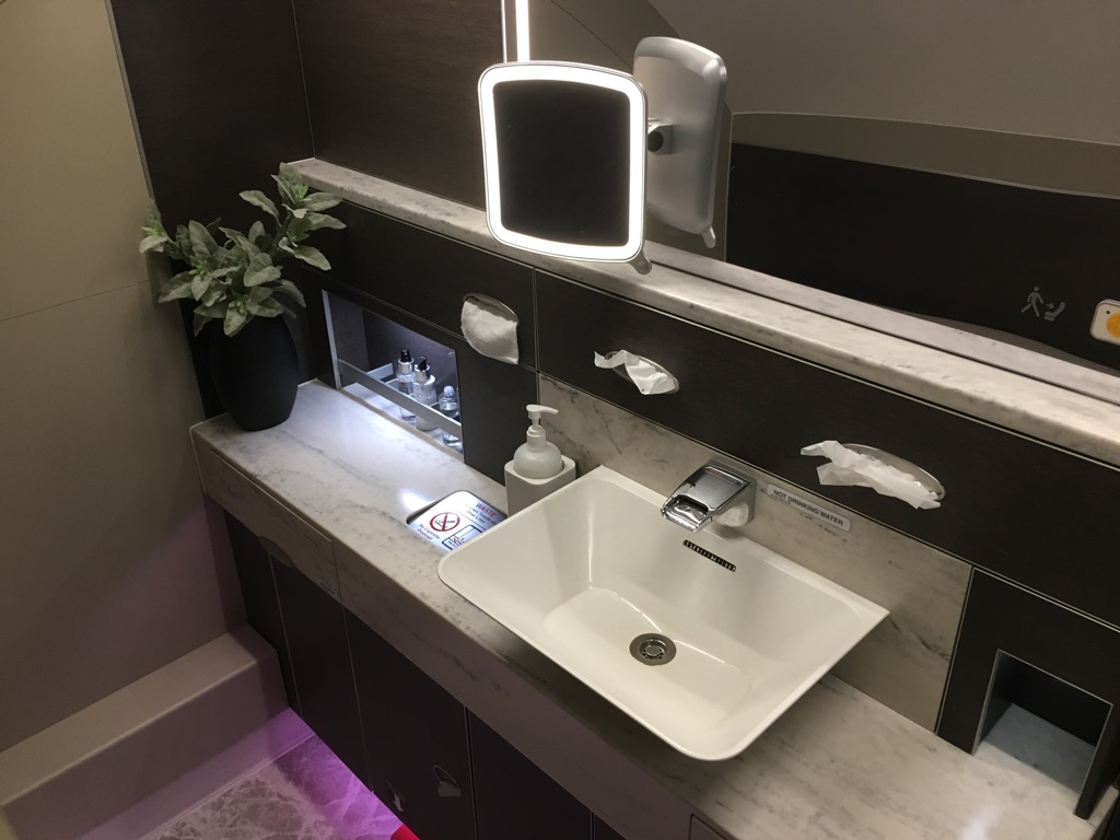 Beim Gespräch mit einem der Flugbegleiter vor dem Start, in welchem ich erwähnte wie toll ich die neue Singapore Airlines Suite Class im Airbus A380 finde, sagte er zu mir, ich solle mir einmal das Bad anschauen, es würde mir gefallen.