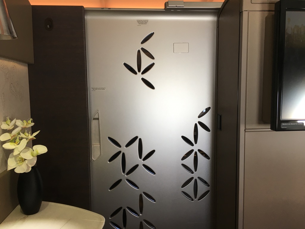 Neben der Tür hatte jede Suite einen eigenen Kleiderschrank, in welchen man seine Jacke und auch Kleider während des Fluges aufhängen kann. Dies kennt man durchaus von anderen First Class Sitzen, aber in der neuen Singapore Airlines Suite Class war dieser Kleiderschrank so groß, dass man ohne Probleme auch zwei Handgepäckkoffer hier verstauen konnte. Dies ist auch wichtig, denn in der Suite selbst ist kein Stauplatz mehr für einen Koffer, z.B. unterm Vordersitz.