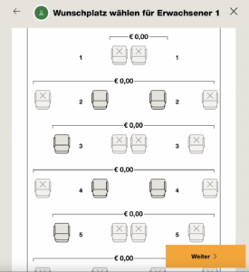 Die Condor Webseite zeigt die Sitze in der ersten Reihe (1E/F und 2A/K) als belegt an.