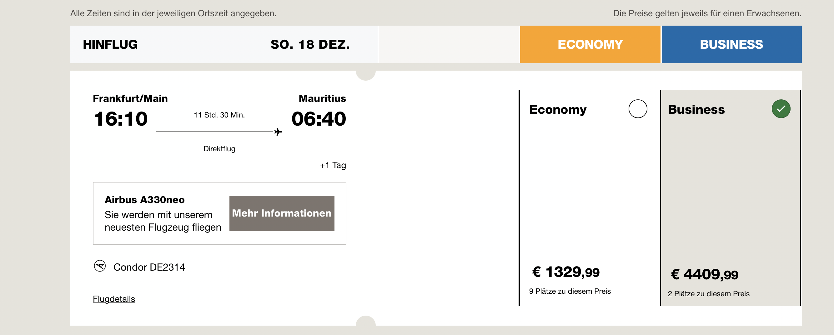 Den Erstflug ab Frankfurt nach Mauritius kann man übrigens noch buchen, allerdings sind die Flüge vor allem in der Business Class mit über 4000 Euro für den one way recht teuer.