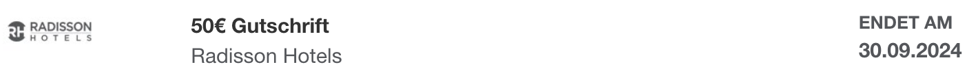 Aktivieren Sie das Angebot, geben Sie bis 30.09.2024 bei teilnehmenden Radisson Hotels oder online auf www.radissonhotels.com/de-de/ insgesamt mindestens 250€ aus und Sie erhalten einmalig 50€ Gutschrift.