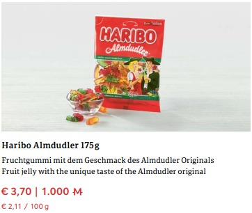 Natürlich gibt es auch weiterhin das österreichische Erfrischungsgetränk überhaupt. Für die Dose Almdudler zahlt Ihr 3,30 Euro oder 900 Meilen. Und Almdudler gibt es nicht nur als Getränk sondern mittlerweile auch als Weingummi. Die 175 Gramm Tüte von Haribo gibt es für 3,70 Euro oder 1.000 Meilen.