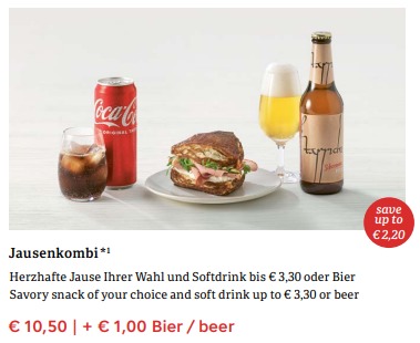 Alle Sandwiches werden auch zusammen mit einem Softdrink im Wert von bis zu 3,30 Euro als Jausenkombi angeboten. Der Preis für die Jausenkombi liegt bei 10,50 Euro oder 11,50 Euro, wenn es dazu ein Bier sein soll. Bier ist ein gutes Stichwort. Denn gutes Bier auf einem Flug zu bekommen, ist eine Herausforderung. Irgendwie scheinen Fluggesellschaften es für eine gute Idee zu halten, Menschen mit Heineken oder Becks abschrecken zu müssen. Oder wenn man trendy ist, ein IPA Craftbeer im Sortiment zu haben. Ob Austrian Airlines da gutes Bier im Angebot hat, da fehlt es mir an Erfahrung. Auf jeden Fall gibt es zwei lokale Optionen und das ist schon mal sehr wertvoll: