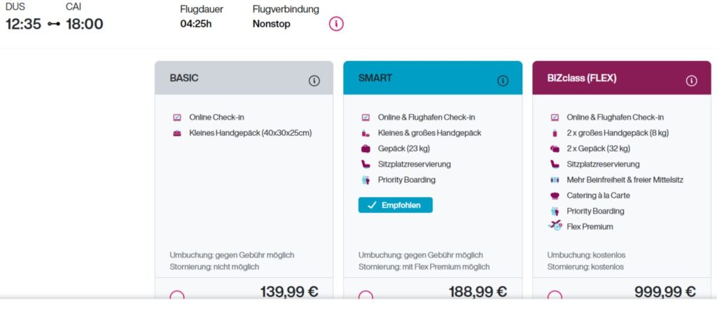 Buchbar sind die Flüge direkt auf der Webseite von Eurowings. Für einen Oneway-Flug verlangt die Airline im Basic Economy-Tarif ohne Gepäck mindestens 139,99 Euro. Wahnwitzig wirken die Business Class Flex-Tarife für 999,99 Euro. Aber das könnte damit zusammenhängen, dass sich die Lowcost-Airline eventuell noch nicht entschieden hat, ob sie auf den Flügen nach Kairo einen Business Class-Service durchführen werden.