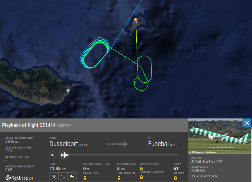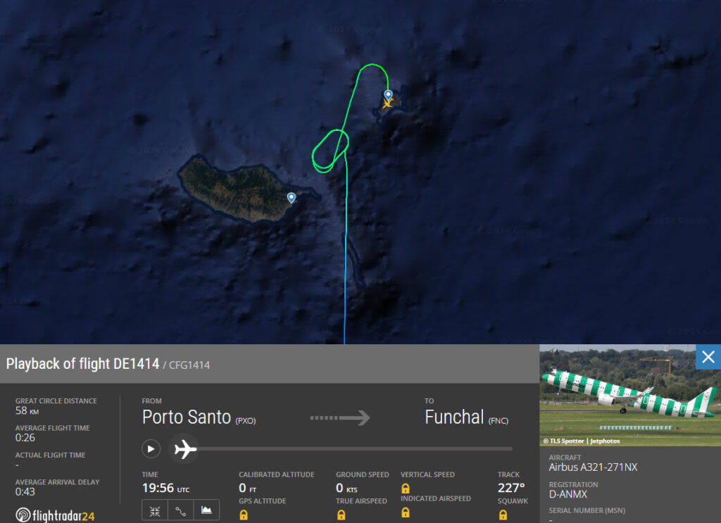 Doch dann kam das Wetter dazwischen. Auf Madeira herrschten heftige Winde. Stärker als üblich. Das wirbelte auf der portugiesischen Insel den Flugplan durcheinander. Und auch den des D-ANMX. Der kreiste laut Angaben des Branchenportals AeroTelegraph.com insgesamt 18 Mal über dem Atlantik, ehe sich die Cockpitbesatzung für Plan B entschied. Dieser sah eine Landung auf der benachbarten Insel Porto Santo (PXO) vor. Dort landete die Maschine auch sicher um 19:39 Uhr.