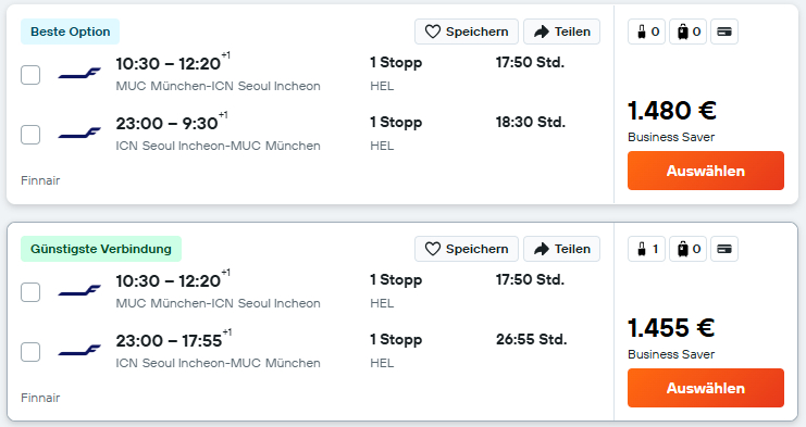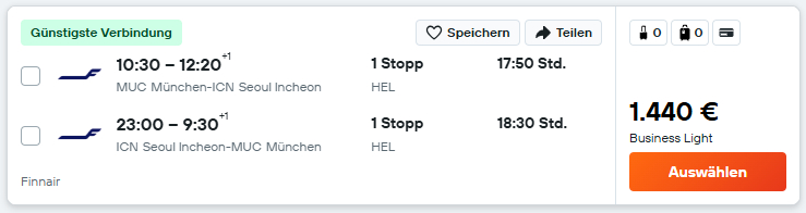Im Wettbewerb um günstie Business Class-Flüge nach Seoul überbieten sich derzeit T’way und Finnair. Die Preise des Oneworld-Mitglieds Finnair für Flüge ab Deutschland sind nun nochmals gesunken. Während Ihr bei unserem Business Class Flug-Deal vor ein paar Wochen noch mindestens 1.533 Euro für einen Return-Trip in die Hand nehmen musstet, starten die günstigsten Preise im Light Tarif nun bereits bei 1.440 Euro. Also noch mal fast 100 Euro günstiger als bisher.