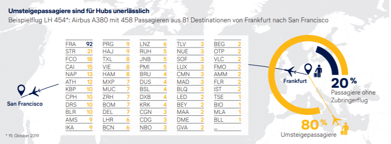 In einem offenen Brief an die Politik hat Lufthansa bei einem Flug von Frankfurt nach San Francisco dargestellt, wie viele Passagiere auf diesem Flug Umsteiger sind. Hierbei kommen nur 20% der Passagiere als Lokalpassagiere auf den Flug, der Rest kommt von anderen Flügen.
