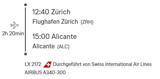 - LX2173 | 16:25 Uhr Alicante (ALC) – 18:40 Uhr Zürich (ZRH) | Airbus A340-300 | immer samstags