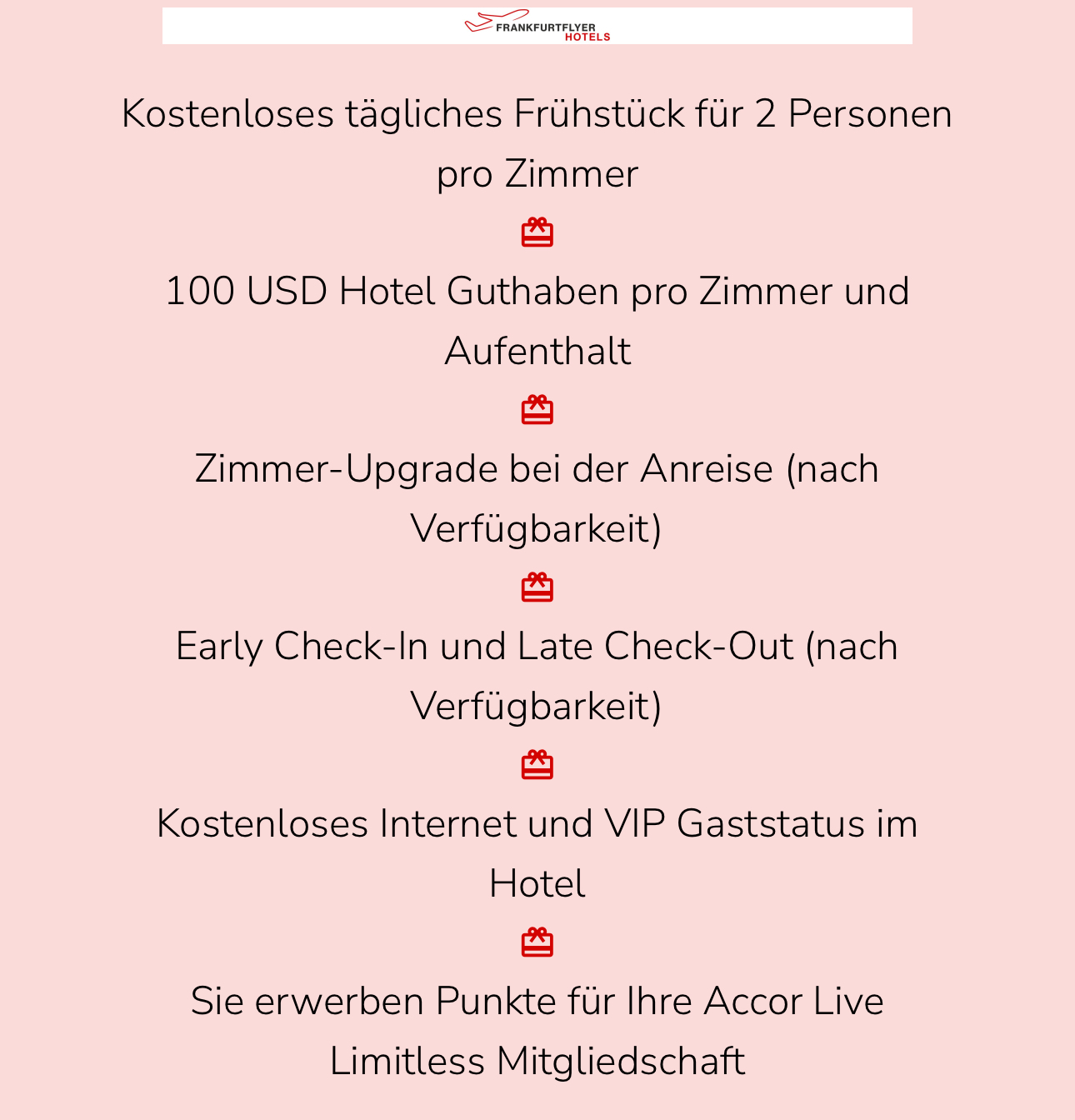In einigen Hotels kann man Vorteile und Benefits wie kostenloses Frühstück, Upgrade, early Check-In, late Check-Out und Vorzugsbehandlung quasi ohne Status mit dazu buchen. Die Vorteile bekommt Ihr in vielen Accor Hotels bei einer Reservierung über Frankfurtflyer Hotels: