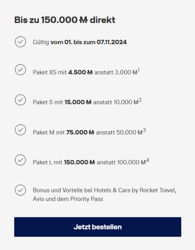 Vor Kurzem hatte Miles & More vorzeitig die Notbremse gezogen und das Angebot auf Grund zu großen Erfolges eingestellt. Das war quasi eine „Bundle & Gone„, wie ich seiner Zeit etwas spöttisch anmerkte, obwohl die Aktionsbedingungen genau diesen Fall vorgesehen hatten. Um Enttäuschungen im November 2024 vorzubeugen, hat man die aktuelle Promotion einfach als Flashsale aufgesetzt und bis zum 7. November 2024 begrenzt. Im Zweifelsfall ließe sich die Aktion noch verlängern, wenn das Limit noch nicht ganz ausgeschöpft ist.