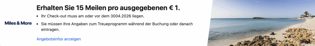 Wichtig zu beachten ist aber, dass man die Buchungen über die entsprechende Landingpage bei Booking.com durchführt, wo ihr auch auf die 15-Fach Miles&More Meilen hingewiesen wird. Die 15 Meilen je Euro erhaltet Ihr dann für alle Buchungen von Hotels die ihr bis zum 30. Juli 2025 durchführt. Dabei muss der Hotelaufenthalt bis zum 30. April 2026 Stattfinden. Die Meilen werden Euch erst einige Zeit NACH dem Aufenthalt gutgeschrieben.