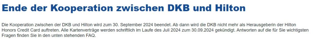 Am Donnerstag, den 2. Mai 2024 ging dann auch die offizielle E-Mail zum Ende der Partnerschaft an alle Kreditkarteninhaber raus, wie unsere aufmerksamen Leser Tom, Christian und Ralf in unserem vorherigen Beitrag zum Ende der Zusammenarbeit feststellten. Bereits ab dem 1. Oktober 2024 könnt Ihr die Hilton Honors Visakarte der DKB nicht mehr nutzen. Eine Kündigung sollte jeder Kreditkarteninhaber im Juli 2024 von der DKB erhalten.