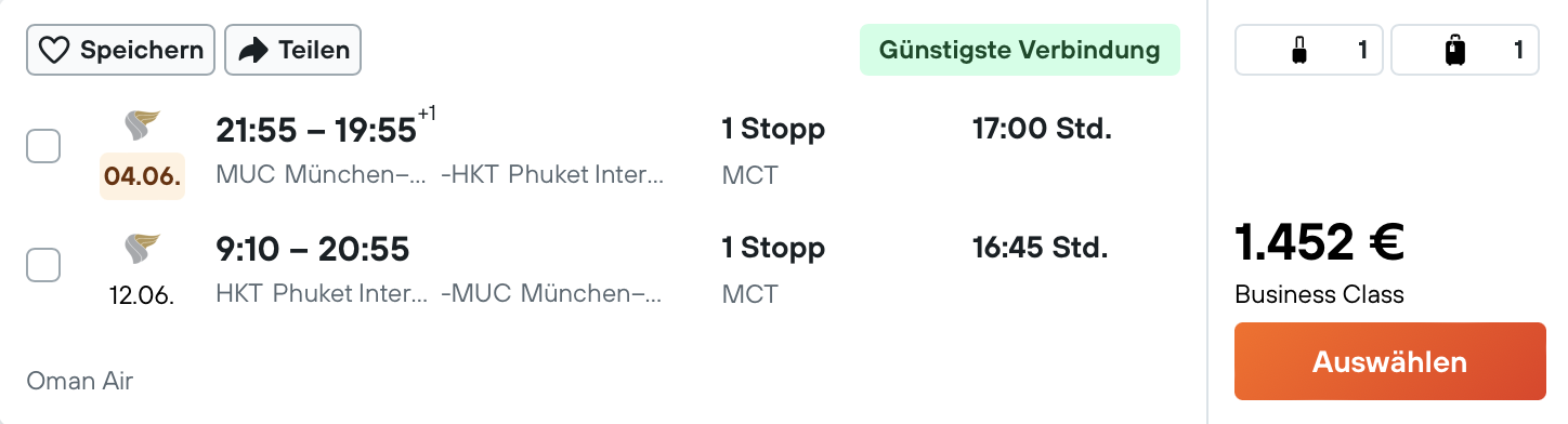 Es sind wirkliche Kracher Angebote von der Oneworld-Airline Oman Air. Für 1.452 Euro in der Business Class nach Phuket fliegen, solche Preise findet man wirklich selten. Dabei kommt der günstige Preis aber auch mit einem Nachteil, denn man muss mindestens auf einem Teil der Reise mit der regionalen Business Class von Oman Air leben.