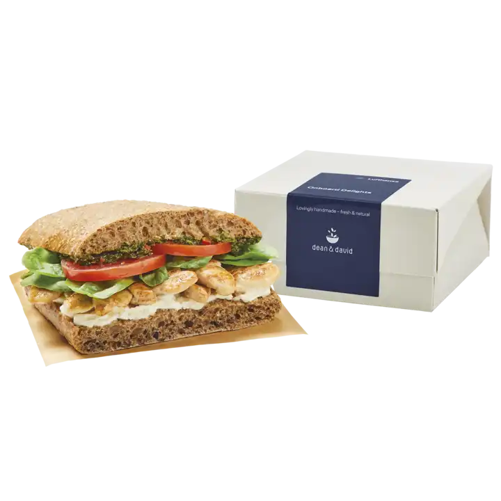 Lufthansa Kunden essen am liebsten Sandwiches, Chips oder die Brezel. Daher bleiben diese Dinge auch im aktuellen Sortiment. Sandwiches wurden ausgetauscht, aktuell stehen das dean&david Chicken Chimichurri und das besagte Paris-Sandwich in der Karte. Letzteres ist mit Ziegenfrischkäse, getrockneten Datteln, Paprika, Weintrauben, Rucolasalat und einer Honig-Senf-Marinade gefüllt.
