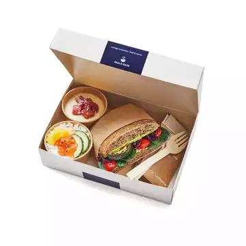 Der Kuchen hat sich scheinbar etabliert, hier wechselt die Sorte im Sommer zu einem gefüllten Rote-Früchte-Mandelkuchen für 4,20€ oder 1.200 Meilen- mit Heißgetränk gibt es einen Sonderpreis. In eine „Best of“-Box sind Sandwich, Bowl & kleines Dessert zusammen.