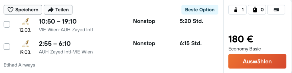 Übrigens kann man diese Tarife auch zu sehr günstigen Preisen als oneway buchen, was gerade bei aufwändigen Trips oder in Kombination mit Meilentickets interessant sein kann. So findet man die Etihad Airways Flüge von Wien nach Abu Dhabi, tatsächlich ab 90 Euro oneway.