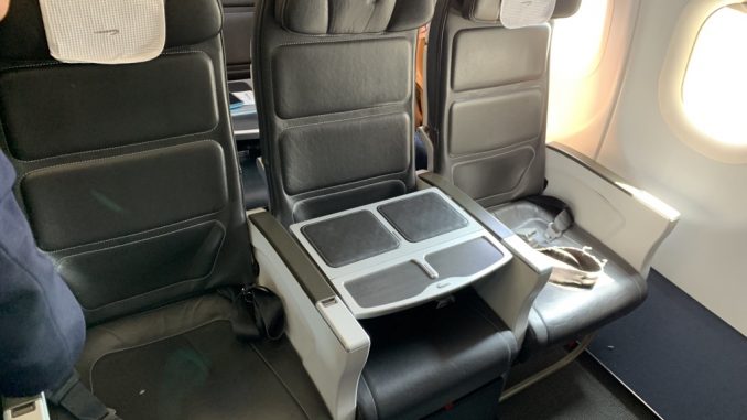 British Airways nennt die Business Class auf Kurzstrecken „Club Europe“ und man bietet hier im Wesentlichen das Konzept, dass auch andere Full Service Airline in Europa bieten. So sitzt man in den vorderen Reihen auf einem normalen Economy Class Sitz, aber der Mittelsitz bleibt garantiert frei. British Airways hat hier in den vorderen Reihen auch bequemere Sitze verbaut mit einer Kopfstütze und man hat eine Ablage über dem Mittelsitz.