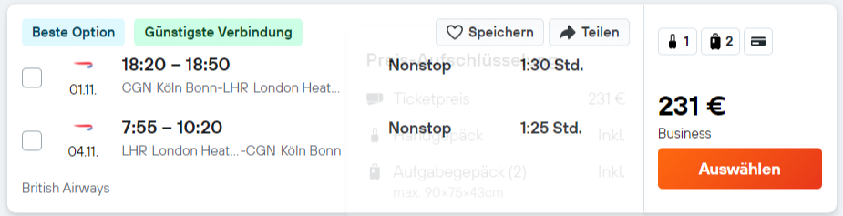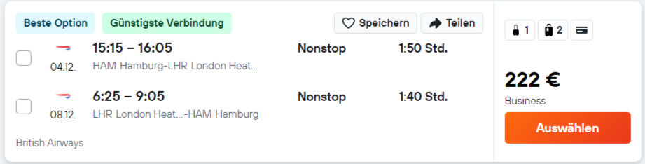 Die Preise beziehen sich immer auf den Hin- und Rückflug in der British Airways Business Class nach London auf den Direktflügen