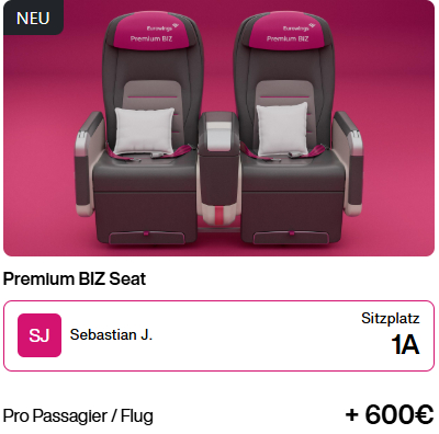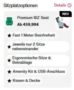 💶 Hoher Aufpreis: ab 400€ zusätzlich pro Flug zum regulären BIZ-Class-Ticket.