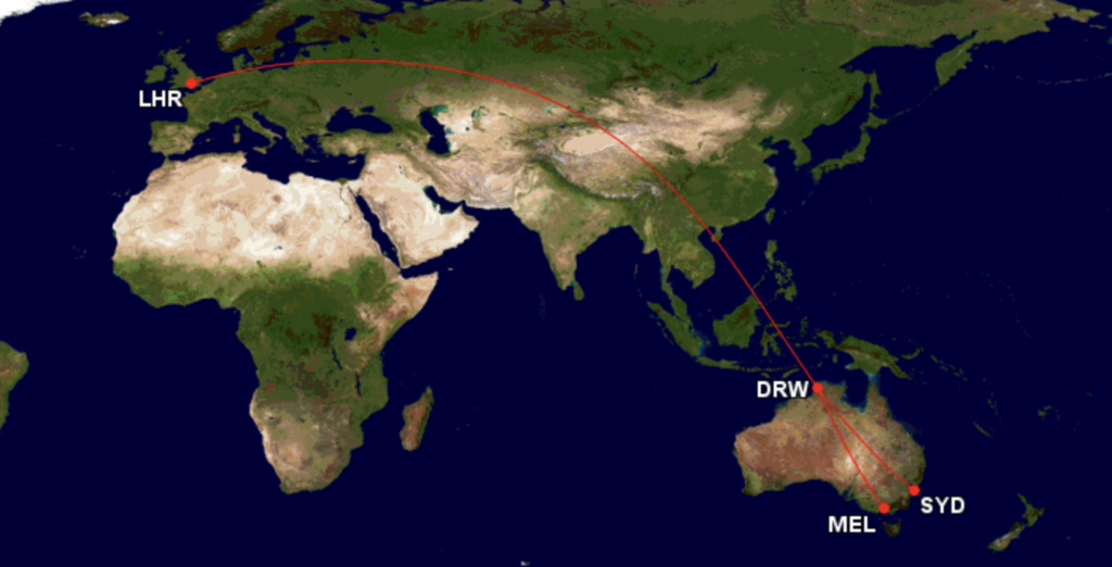 Die Flüge von Sydney und Melbourne nach London bleiben auch bei dem Zwischenstop in Darwin sehr lang. So benötigt man alleine für den Flug über den Kontinent nach Darwin über vier Stunden und dann nach der Zwischenlandung über 17 Stunden Flugzeit bis London.