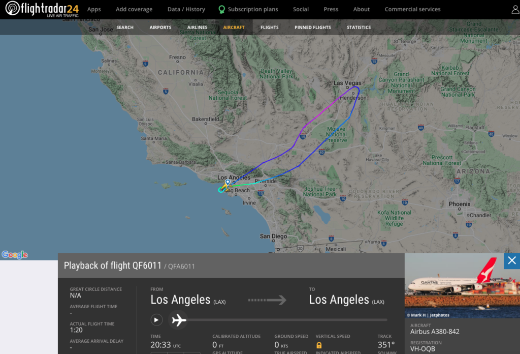 Die VH-OQB wurde aus dem kalifornischen Victorville nach Los Angeles geflogen, wo Qantas eine große eigene Wartung unterhält. Nach einem Testflug vom LAX Airport am 17. August, ist man dann am 19 August von Los Angeles non stop nach Dresden geflogen.