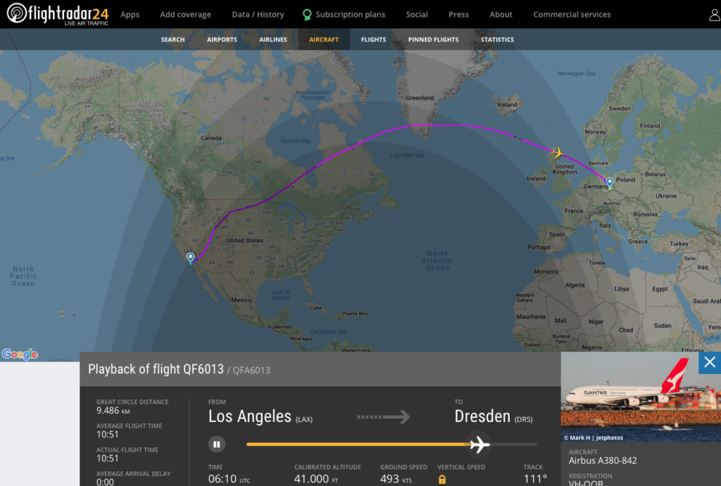 Während der Airbus A380 und besonders der Qantas Airbus A380 in Los Angeles ein häufiger Gast war, gehört Dresden sicherlich nicht zu den Drehkreuzen, an welchen man dieses riesige Flugzeug auf einem Transatlantik Flug erwartet, aber Qantas flog gerade einen Airbus A380 in knapp 11 Stunden von Los Angeles nach Dresden