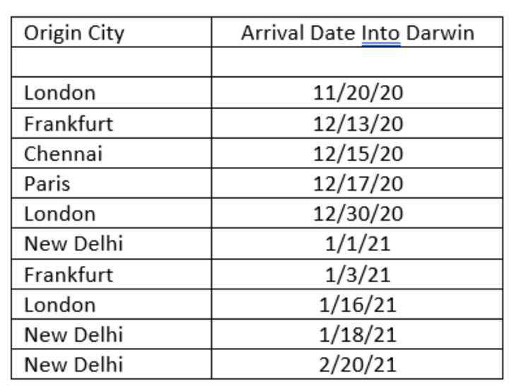 Alle Passagiere welche auf den Flügen mitfliegen wollen müssen einen maximal 48 Stunden alten PCR Test beim Check-In vorlegen und in Darwin in eine 14- tägige, staatliche überwachte Quarantäneeinrichtung gehen um die potenzielle Verbreitung des Corona Virus in Australien zu verbinden.