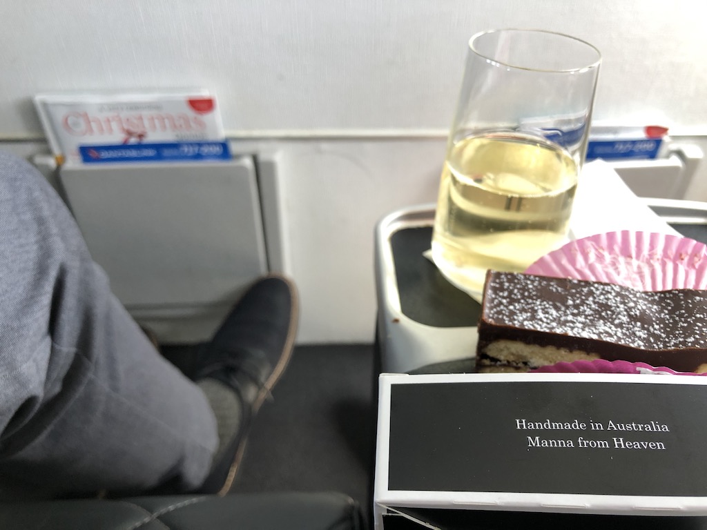 Der Service war sehr aufmerksam, zum Essen standen auf der verhältnismäßig kurzen Strecke ein kalter Salat oder eine warme Mahlzeit zur Auswahl. Verschiedene Weine rundeten das Menu ab, Getränke wurden permanent nachgeschenkt. Die Sitze hatten USB-Anschluß und Steckdosen. Obwohl es keine Internetverbindung gab, wurde das kostenlose Qantas Entertainment per W-LAN für eigene Endgeräte angeboten.