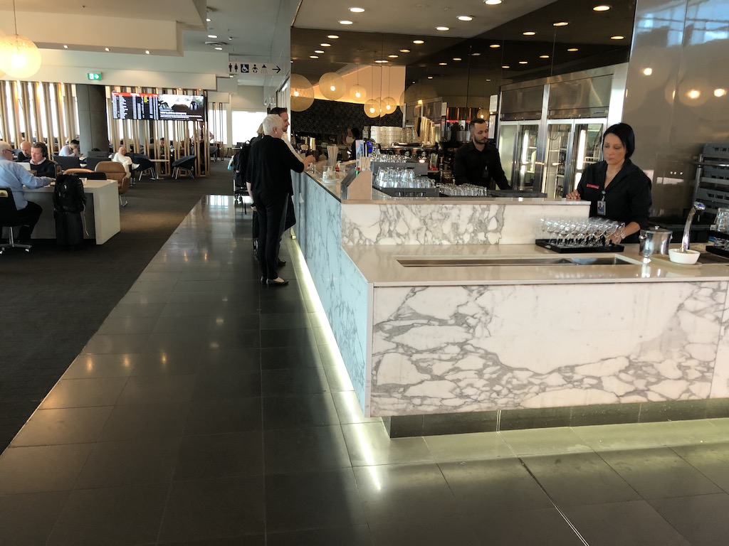 Die Qantas Business Class Lounge ist am Drehkreuz in Sydney zwar gut besucht, hat aber gigantische Kapazitäten. Es gibt zahlreiche Sitzmöglichkeiten wie z.B. Sessel, Barhocker oder Tische die zum Arbeiten, Entspannen oder Essen einladen. Eine riesige Bar bietet 5 verschiedene Weine aus der Region und zahlreiche Cocktails.