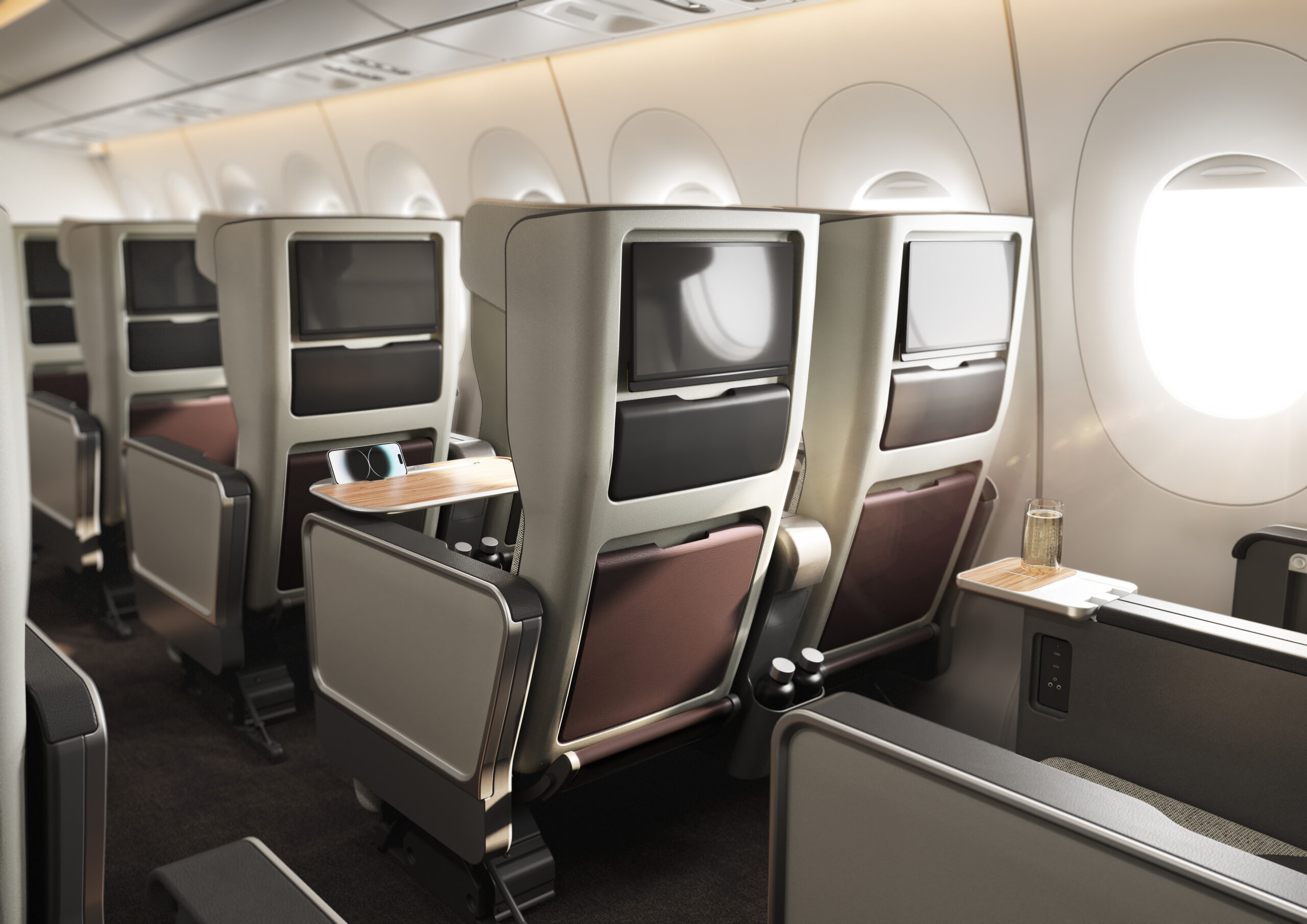 Mit dem Airbus A350-1000 wird Airbus eine komplett neue First Class, Business Class, Premium Economy und Economy Class einführen, wobei komplett neu hier keine noch nie gesehenen Innovationen bedeutet, sondern nur moderne und aufgefrischte Kabinen. Grundsätzlich hat man hier weiterhin ein sehr „normales“ Kabinenprodukt, wenn auch sehr hochwertig.