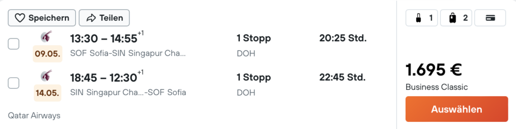 Qatar Airways und vor allem die Business Class von Qatar Airways wird immer wieder als die Beste der Welt ausgezeichnet und entsprechend gefragt sind auch Flüge mit der Airline. Aktuell kann man erstaunlich günstig von Sofia über Doha nach Singapur in der Business Class von Qatar Airways fliegen. Mit Preisen ab 1.695 Euro kann man den Zubringer nach Sofia auch durchaus rechtfertigen.