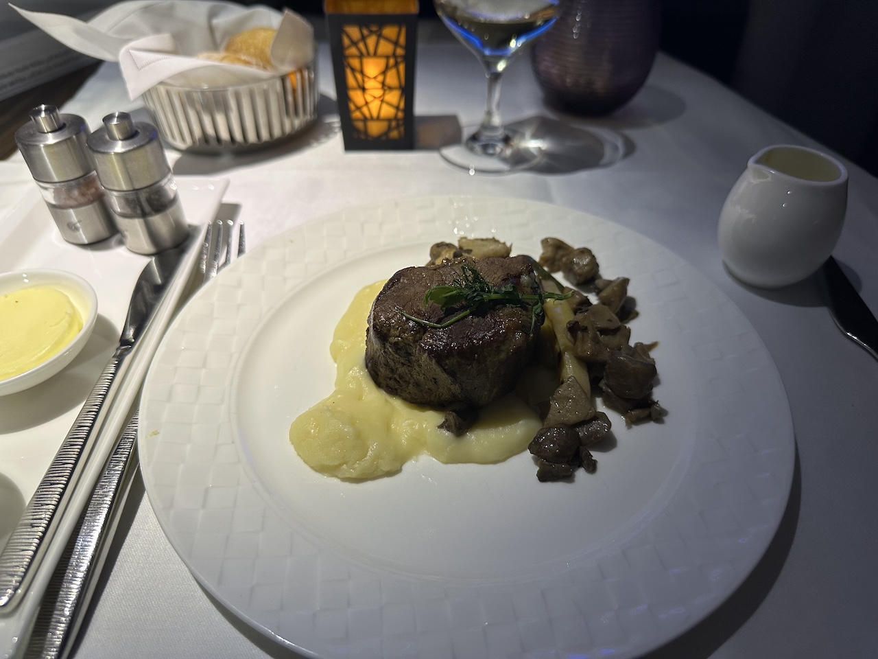 Zum Service wird der Tisch manuell eingedeckt, dazu kommen Salz- und Pfeffermühle, Butter, Olivenöl in verschiedenen Geschmacksrichtungen und eine elektrische Kerze. Zum Hauptgang haben wir Lamm vorbestellt, die andere Wahl fiel auf das Rind: