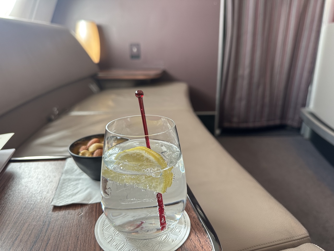 Service schreibt man bei allen Golfcarriern groß, Qatar ist hier keine Ausnahme. Los geht es mit der Signature Mint Lemonade, Saft oder Champagner, dieser wird als Brut oder Rosé angeboten. Heiße oder kalte Tücher gibt es nicht mehr, stattdessen kommt die abgepackte Variante zum Einsatz.