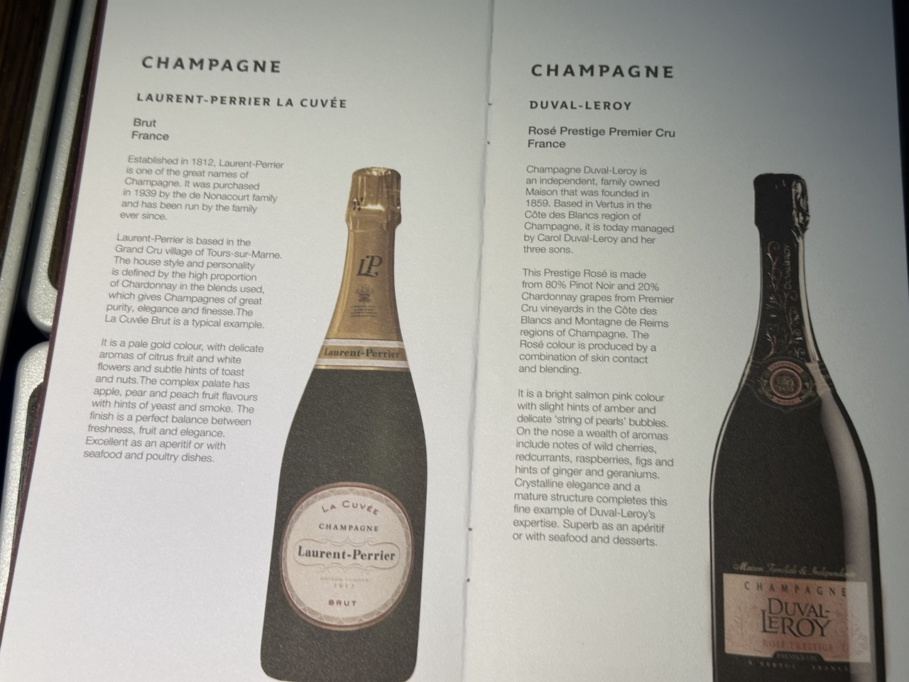 Ich persönlich mag die Getränkekarte inkl. der Abbildungen aller Weine. Im Sortiment sind mehrere Champagner, Weiß- und Rotweine, Port- und Dessertwein und jede Menge Spirituosen und Softdrinks sowie Heißgetränke.
