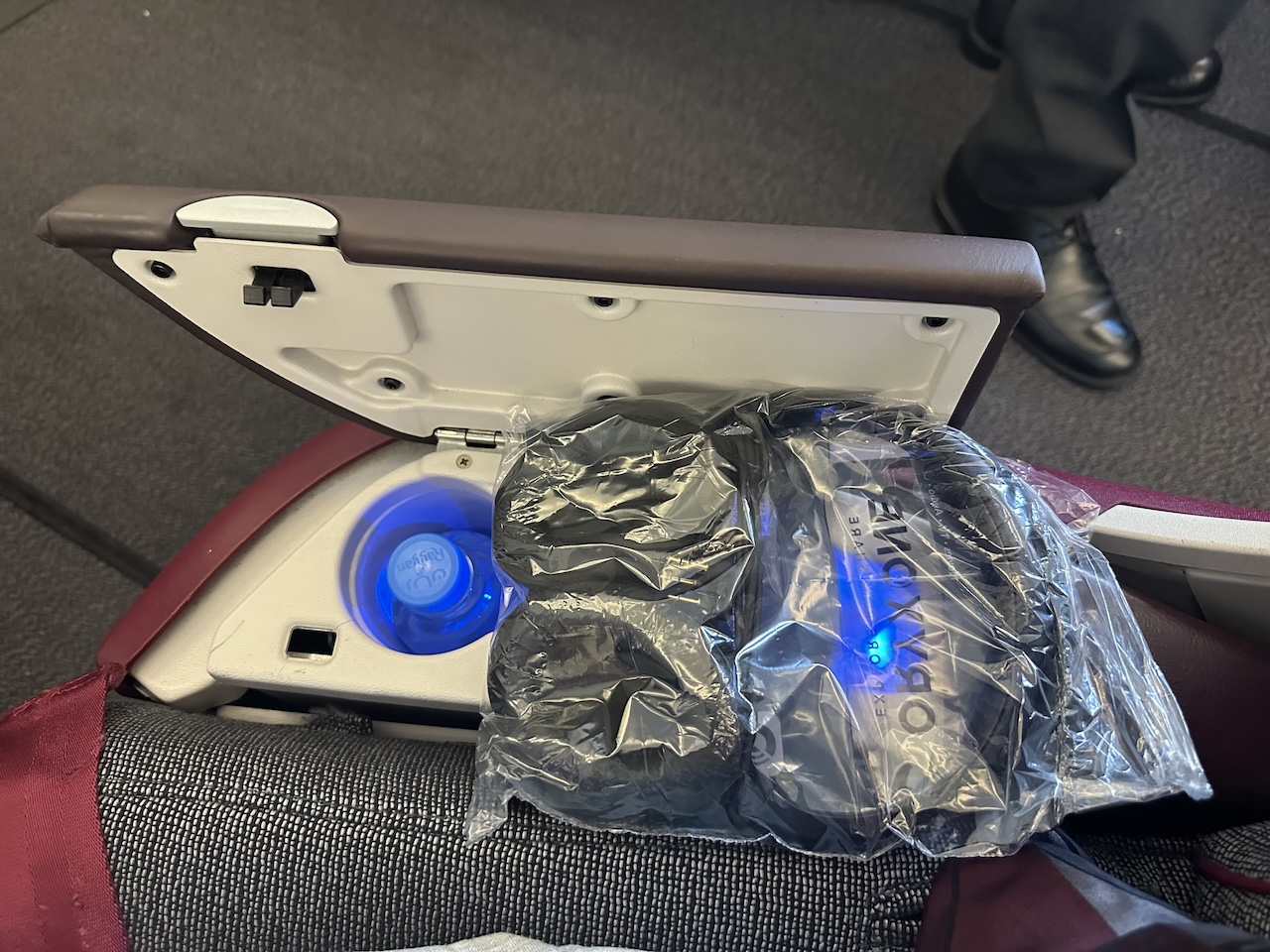 Auf dem Sitz lagen schon diverse Komfortartikel wie Kissen, Decke und Amenity Kit. Eine Wasserflasche und Kopfhörer sind unter der Armlehne.