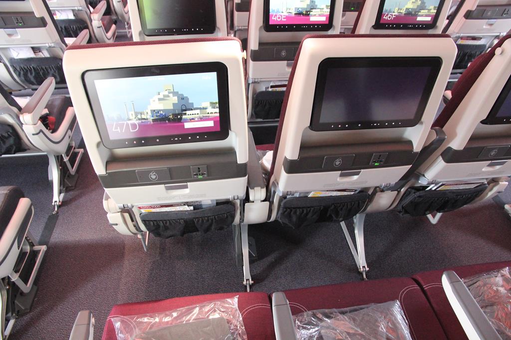 Die Economy von Qatar Airways ist sehr modern und großzügig gestaltet. In den neuen Flugzeugen des Typ Airbus A350 und 787 ist die Kabine in einer 3-3-3 Bestuhlung verbaut, im Airbus A380 und der Boeing 777-300 ist eine 3-4-3 Bestuhlung verbaut. Der Sitzabstand beträgt 80 Zentimeter und ist damit zwar Branchendurchschnitt, allerdings sind die Sitze so konzipiert, dass man durch die Sitzanordnung und die dünne, untere Rückenlehne mehr Platz für die Beine hat. Einige Plätze, wie zum Beispiel die am Notausgang verfügen über eine extra große Beinfreiheit. Positiv fällt auch auf, dass Qatar für Sitzplatzreservierungen (im Gegensatz zu vielen anderen Airlines) keine Gebühren verlangt.