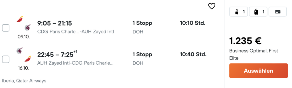 Dabei starten diese besonders attraktiven Angebote in Paris, was oft eine extra Anreise bedeutet. Allerdings kann man Paris, wenn man will, auch sehr gut mit der Bahn erreichen. Ab Paris geht es dann meistens in der legendären Qatar Airways QSuite nach Doha, von wo aus es in der First Class weiter nach Dubai oder Abu Dhabi fliegt.