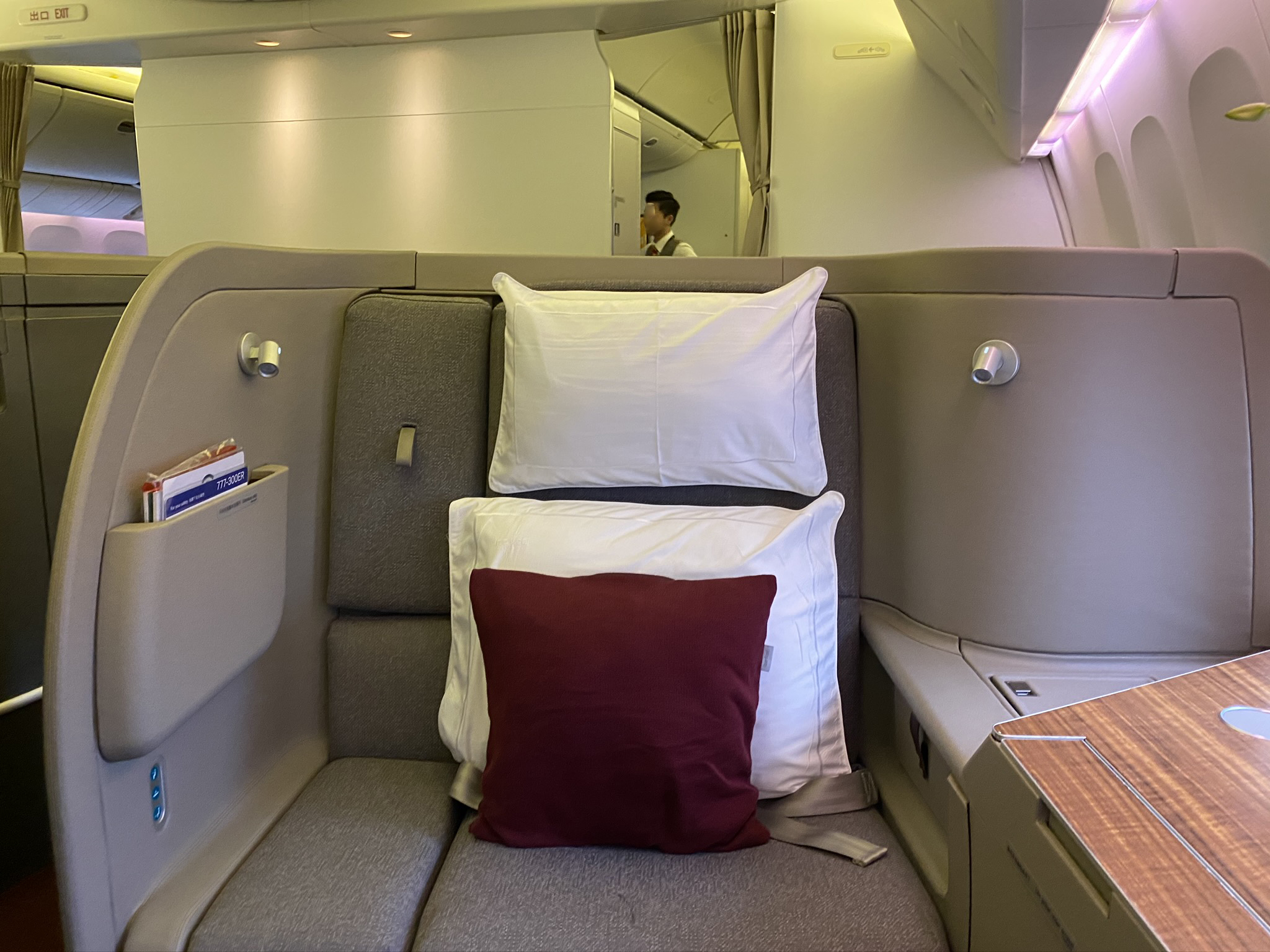 Bei der Buchung wird zwar das Qatar-Produkt angezeigt, dieses ist allerdings nur auf dem Airbus A380 verfügbar. Diese sind 1-2-1 bestuhlt und im Oberdeck des Doppelstöckers installiert. Ihr könnt Euch ein eigenes Bild von dem Kabinenprodukt der Cathay machen, unser Alexander hatte das Vergnügen in de exklusiven First zu reisen und schildert seine Erfahrungen in einer ausführlichen Review.
