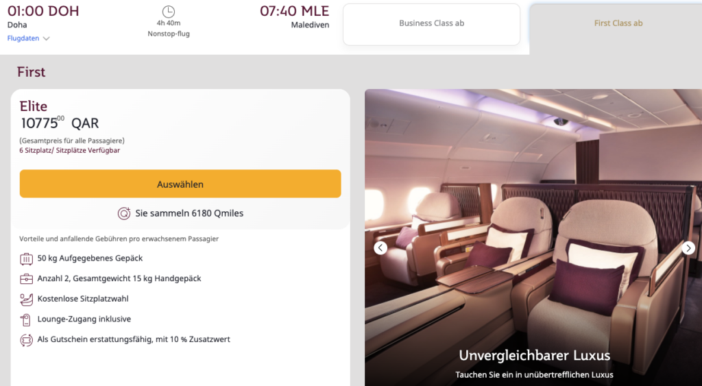 Bei Qatar ist die First buchbar, die Flüge in der Luxusklasse sind auch als Prämie verfügbar. Eine Buchung bei dem eigenen Vielfliegerprogramm kostet bei dem oneway Flug DOH-MLE insgesamt 52.500 Meilen. Besitzer einer American Express Kreditkarte können die Membership Rewards übrigens in einem Verhältnis von 5:4 zum Privilege Club übertragen.