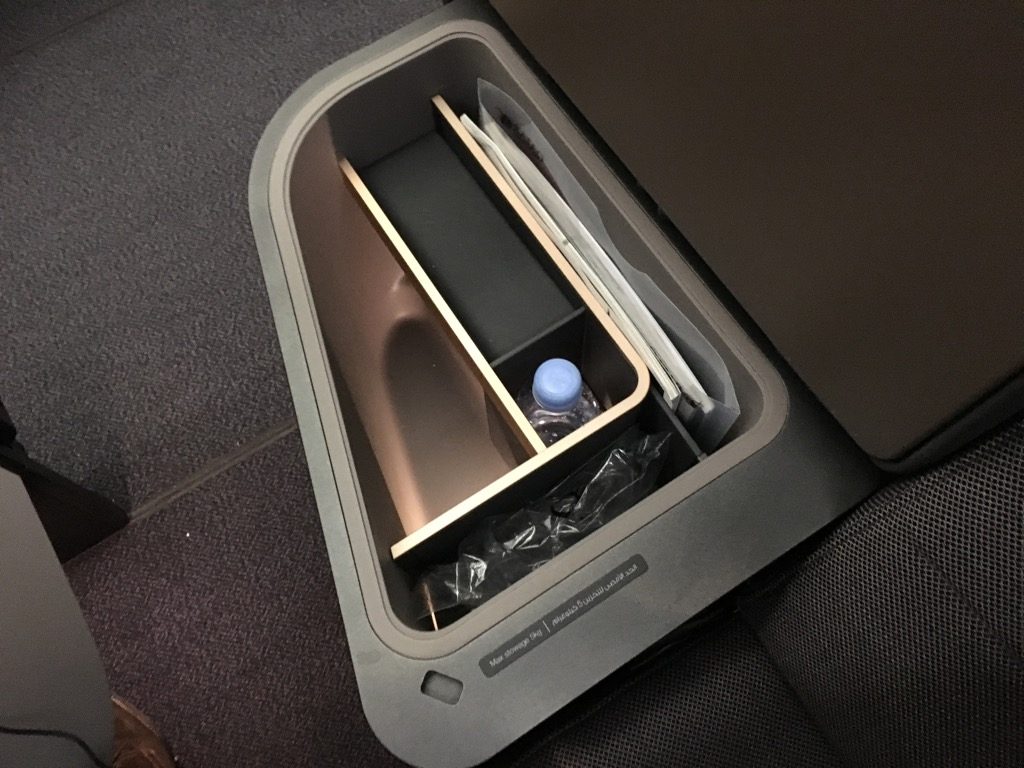 Der Sitz selbst ist für einen Business Class Sitz extrem großzügig. Er ist breit und bietet allerlei Ablageflächen und vor allem Privatsphäre. Neben jedem Sitz befindet sich noch ein Ottomane, welcher gleichzeitig als Armlehne oder als Staufach verwenden. Hier befand sich bereits eine kleine Wasserflasche und die Noise-Cancelling Kopfhörer.
