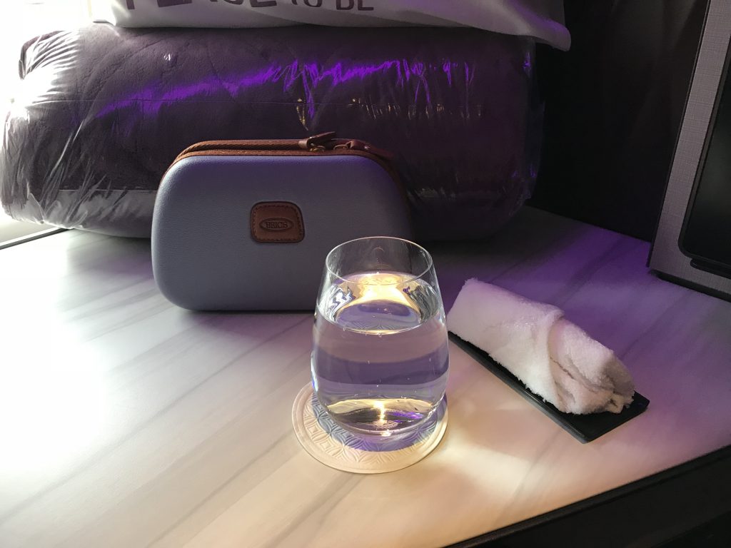 Nachdem ich Platz genommen habe stellten sich bei mir zwei Flugbegleiterinnen vor und fragten nach einem ersten Getränkewunsch. Zum Willkommensdrink wurde auf Wunsch ein kaltes oder warmes Tuch gereicht. Zudem wurde mir angeboten den Sitz zu erklären, was ich höflich ablehnte, da wir schonmal in der QSuite unterwegs waren.
